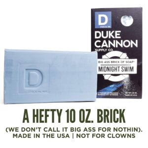 Duke Cannon has never taken a “refreshing dip” in the hot tub of the Best Valur Motel near O’Hare, and he won’t be going down the community waterslide this Saturday. No, Duke Cannon’s idea of aquatic refreshment is a moonlit cannonball into the crystal blue water of a remote forest lake. Experience the refreshing blend of pure water, fresh air, and crisp greens with this American-made soap inspired by the invigorating adventure of a midnight swim. Part of the Great American Frontier Collection from Duke Cannon. Because the outdoors smell nice.