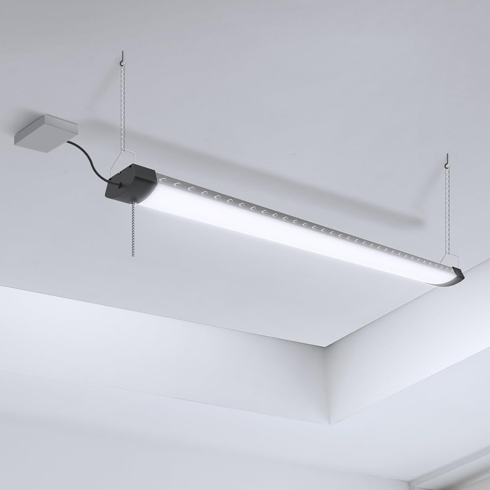 The Feit Electric Shop/4/HO/850 high-lumen LED Shop Light comes fully assembled and provides added brightness to any residential or commercial area. Perfect for either hanging or flush mount installation, this fixture outputs a super bright 12,000 lumens of 5000K Daylight color temperature light. Use it in workshops, garages, warehouses, and large spaces with higher ceilings for extra illumination and energizing light that highlights fine details. The ultra-lightweight and low-profile design includes a 5 ft. plug-in cord and two 6-inch hanging wire harnesses. Link up to three devices for more flexible coverage. It has an average life of 25,000 hours/22.8 years. Choose a no-humming general-purpose task lighting fixture for residential or commercial applications.