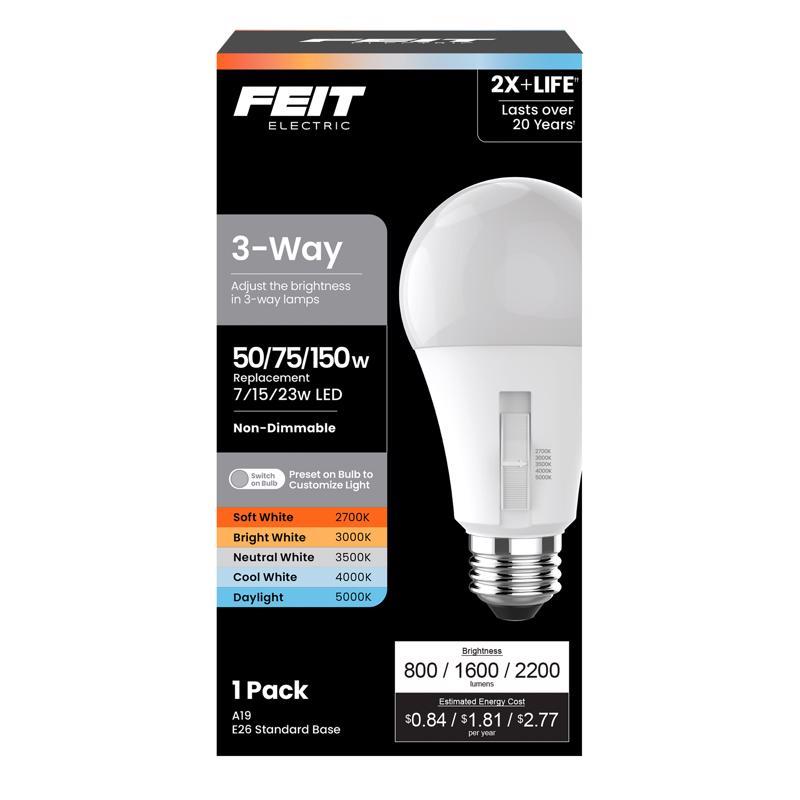 Upgrade old incandescent bulbs to LED technology and get a bulb that gives you five white light choices with Feit Electric's 3-Way Switch Adjustable White LED A19 Light Bulbs. Install them just like any other bulb and select your preferred color temperature on the bulb before installation. Choose from 2700K/3000K/3500K/4000K/5000K for a wide range of Soft White to Daylight color temperature light. With these versatile bulbs, you never have to worry if you have the right color. Ideal for use in bedrooms, living rooms, kitchens, and offices, you can select the color temperature that looks best in any room for any mood. These bulbs can be used in 3-way lamps and fixtures to cycle through 3 different brightness settings. Use the lower setting for unwinding, then increase the brightness for reading, working on tasks, and seeing objects in finer detail. LED technology provides up to 2200 lumens light output while using 84 percent less electricity than equivalent 150W incandescent bulbs. They last up to 25,000 hours, providing up to 22.8 years of reliable energy-efficient light.