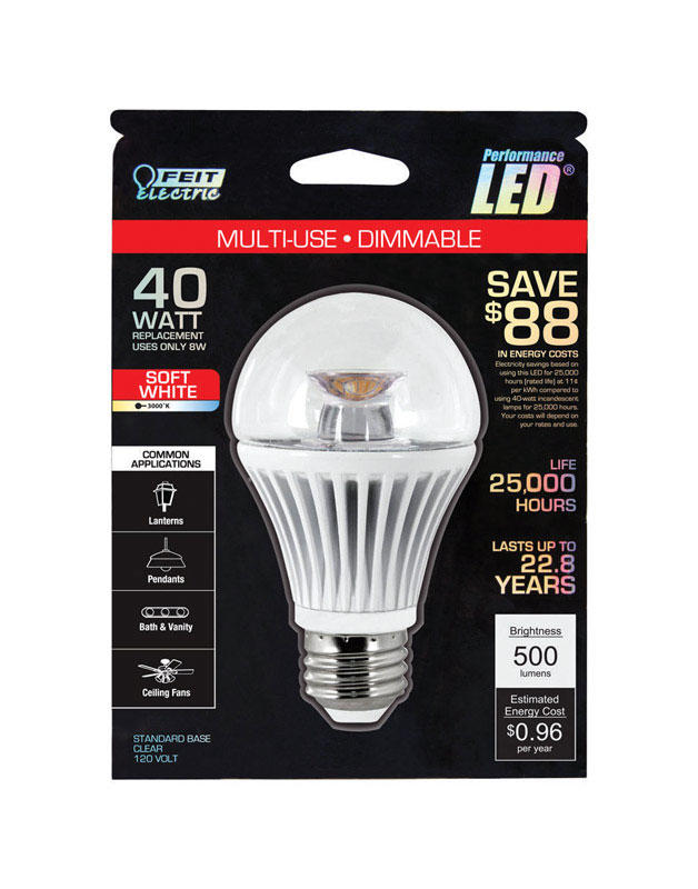 This A19 LED bulb has a photocell for dusk till dawn option for any of your outdoor needs. This Feit Electric LED has a built in option that makes any of your outdoor fixtures instantly light on and off depending on whether it is dusk or dawn. This LED emits 800-Lumens and lasts 25,000-hours while only consuming 10-Watt.
