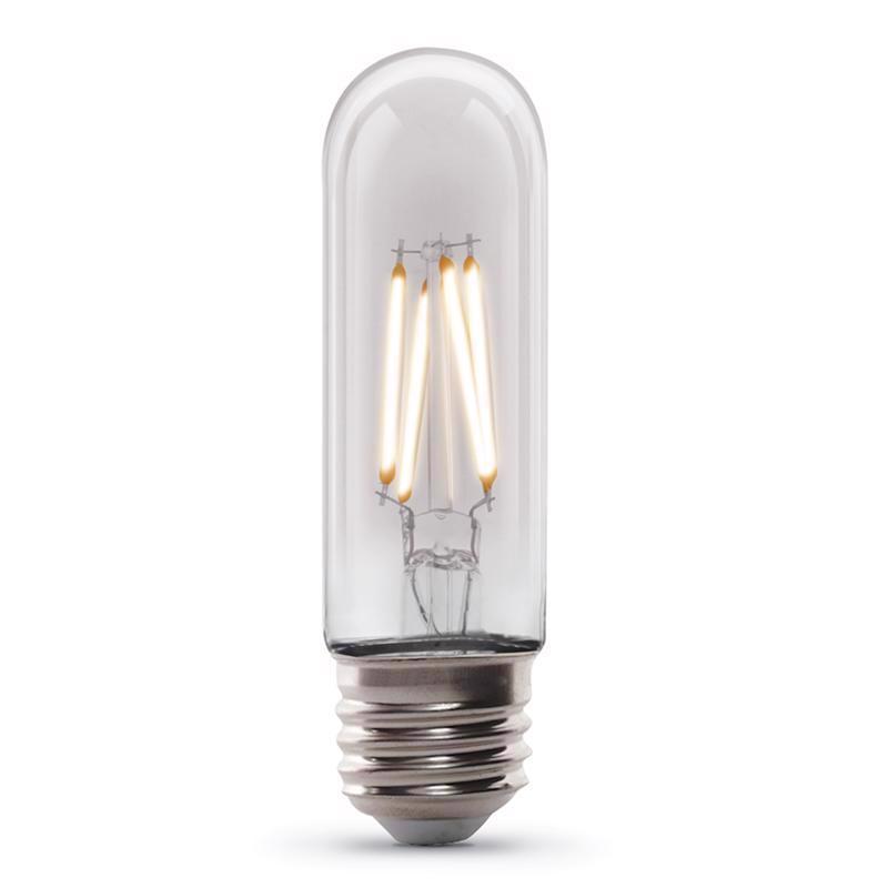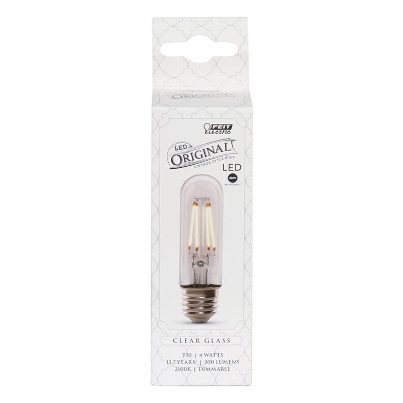 Enjoy all the benefits of advanced LED energy-saving technology with the dimmable Feit Electric T10/CL/VG/LED T10 4w LED Original Vintage Light Bulb. The clear glass bulb produces a light output of 300 lumens and uses 4 watts of electricity, 84 percent less energy than an equivalent incandescent bulb. Get instant on to full brightness with relatively cool running performance. The Original Vintage LED light bulbs have an average life of 15,000 hours / 13.7 years are RoHS compliant and are 100 percent mercury-free. Choose a dependable decorative bulb for residential or commercial applications.